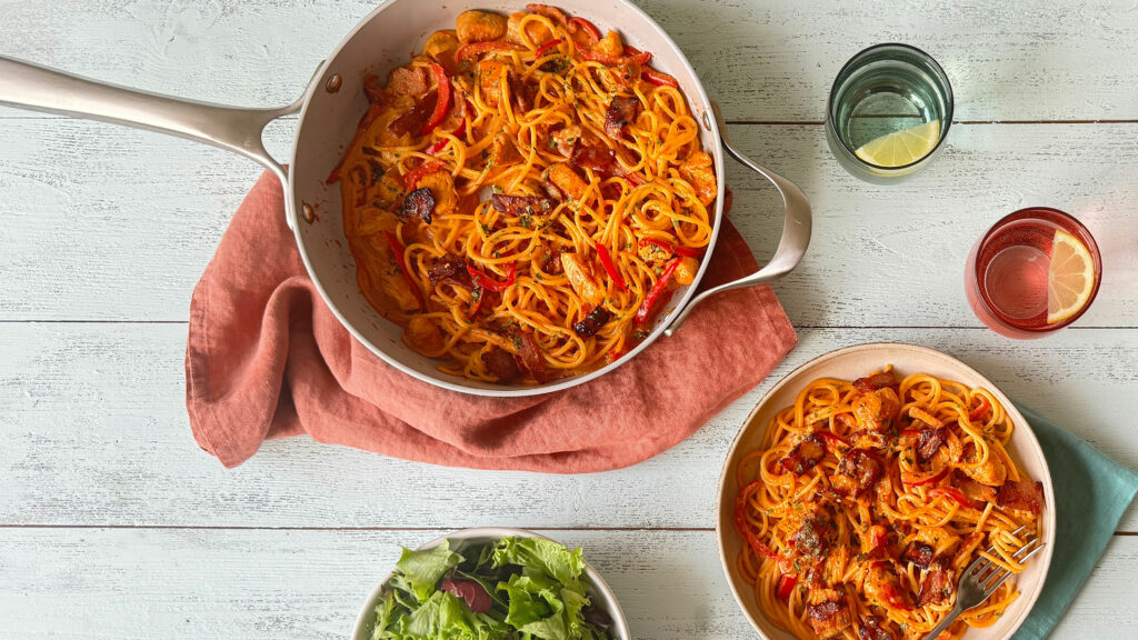 Finnebrogue Naked Smoked Back Bacon, made without nitrites, is the star of this creamy spaghetti dish, created with just a handful of ingredients. It’s a quick dinner that delivers maximum flavour with minimal effort. Simply sizzle the bacon to release its rich flavour, then stir through the creamy sauce, generously loaded with chicken and a drizzle of hot honey.